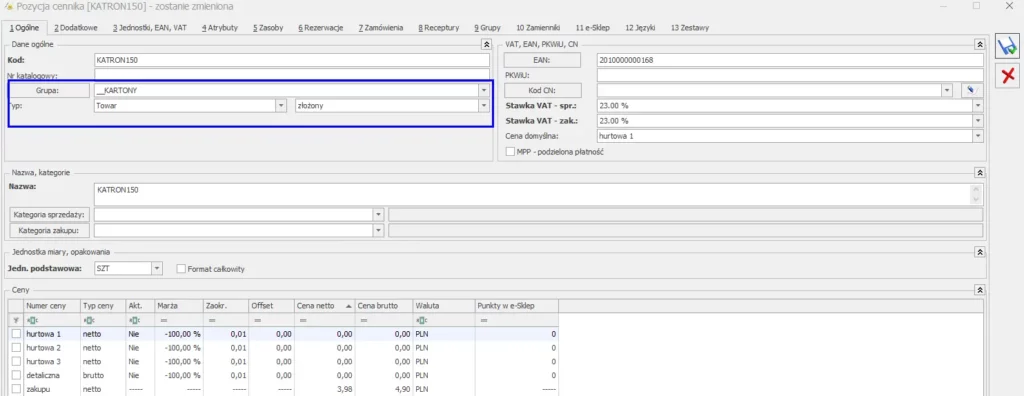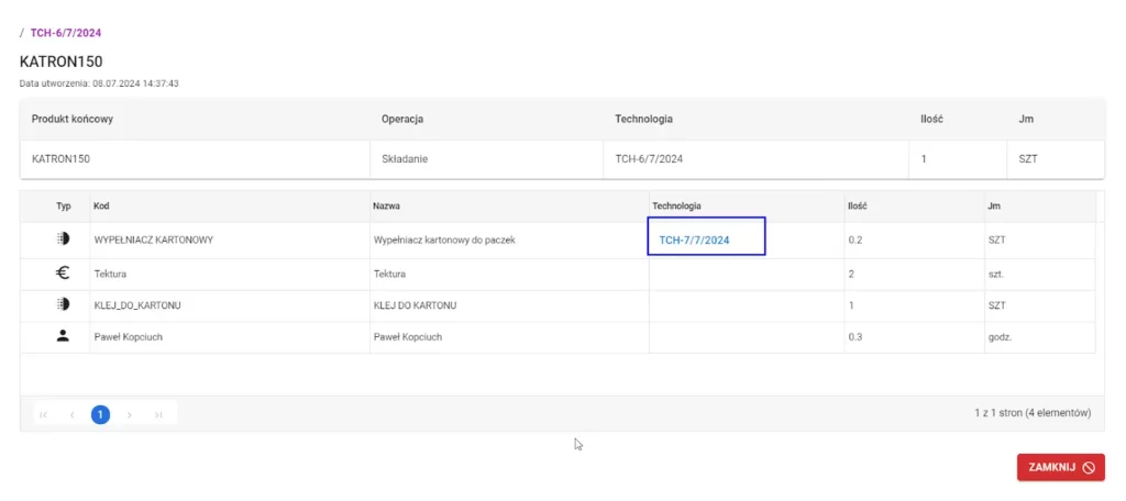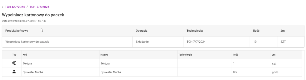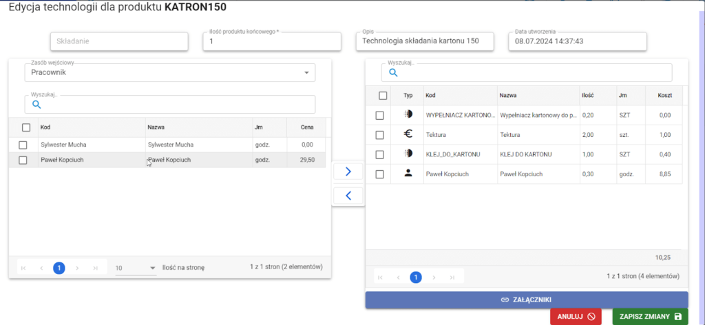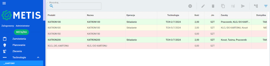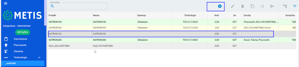 Aby dodać technologie klikamy na produkt w naszym przypadku Karton150 i plusem u góry dodajemy technologię.