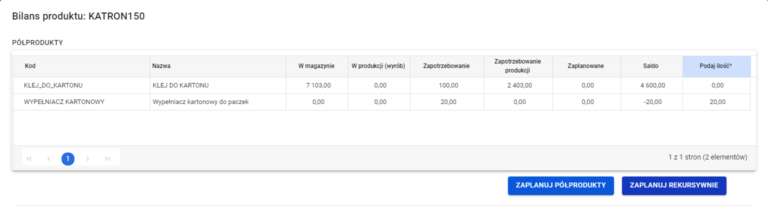 Nasze rozwiązanie posiada narzędzie do planowania produkcji i w czasie rzeczywistym określa ilość dostępnych materiałów do produkcji. W oknie bilansu produktu pracownik może skontrolować ilość na magazynie produkcji, jakie ma zapotrzebowanie dla tego produktu i innych jeśli ten sam komponent wchodzi do wielu różnych produktów.